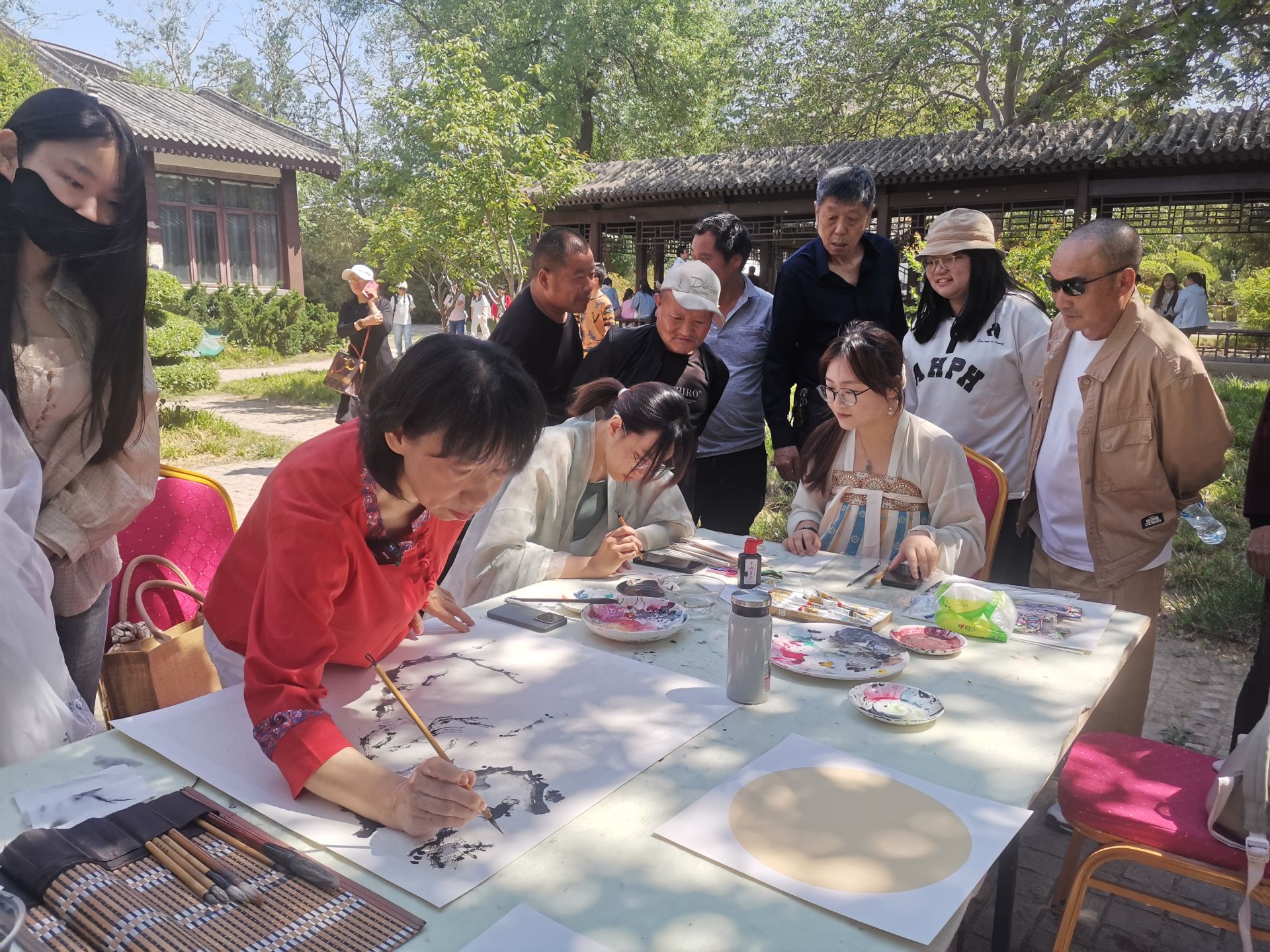 为庆祝“五一”劳动节,弘扬传统文化,5月1日,水上公园联合我校艺术学院、南开区归国华侨联合会,在境界颂艺艺术馆及盆景园举办“劳动之美·园林雅趣”主题书画创作暨汉服文化展示活动。艺术学院庄雪阳老师携学生现场即兴挥毫,以水墨丹青讴歌劳动精神,市民游客在园林雅境中沉浸体验传统艺术与现代审美的交融。
